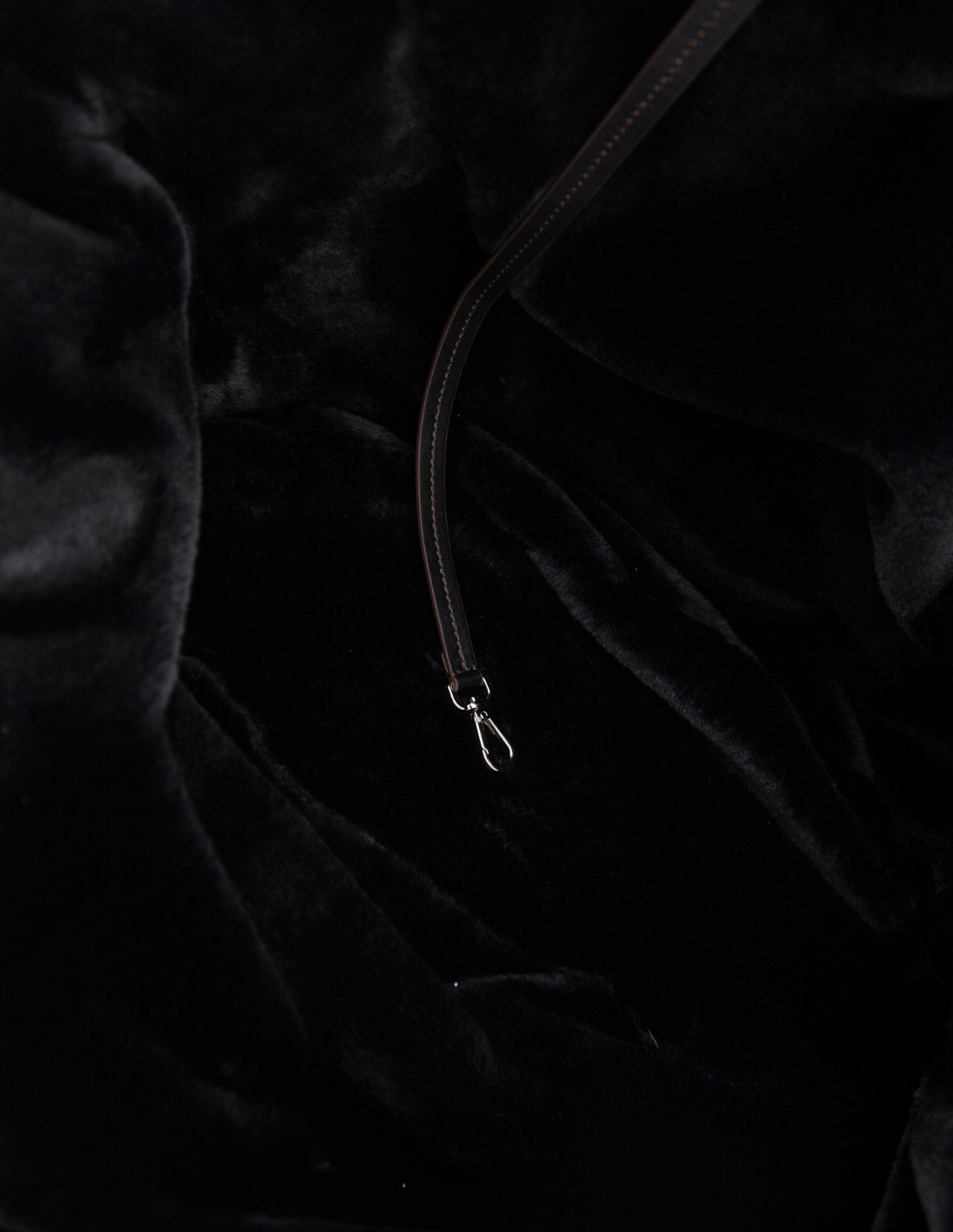 In questa versione la borsa in nylon è in due colori, choco e nera, grazie alla sapiente lavorazione di Carlotta Palermo la borsa è reversibile, può quindi essere utilizzata sfruttando i due colori. I meravigliosi manici in pelle e la pochette esterna sono in colore ONICE con cuciture cioccolato. Il pellicciotto choco si abbina alla borsa.