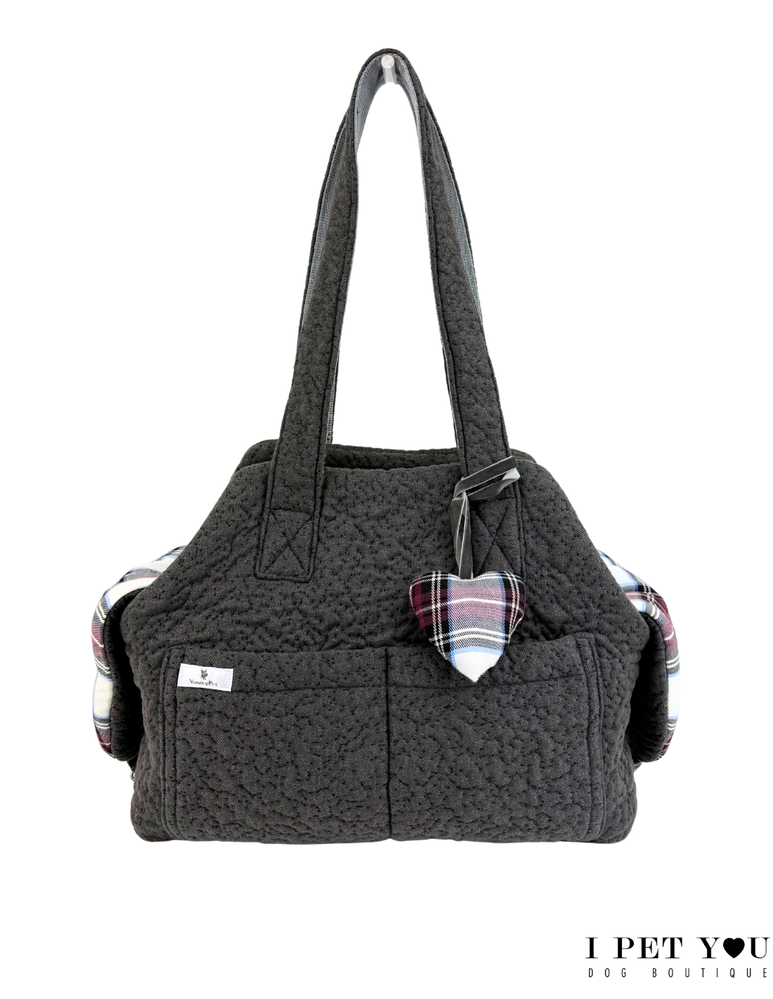 La spaziosa borsa di Vanity Pet dove il vostro cucciolo starà al calduccio e al sicuro. Totalmente foderata con un morbidissimo tessuto, include un soffice cuscino estraibile rivestito di tessuto tartan, due capienti tasche esterne e due cordini di ancoraggio. Il prezioso e particolare tessuto esterno ne ha fatto un prodotto iconico per chi ama mantenere uno stile sofisticato. Oltre al confort per i vostri amici pelosetti è pensata anche per abbinarsi elegantemente al vostro outfit quotidiano. Charms con cuore tartan imbottito.