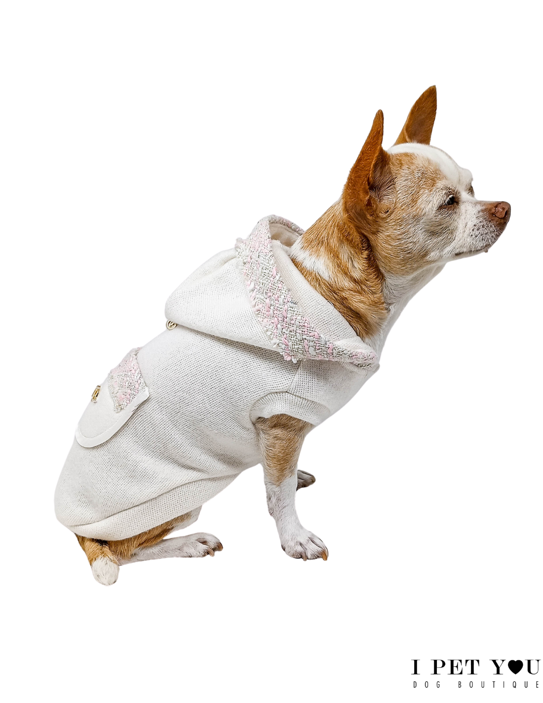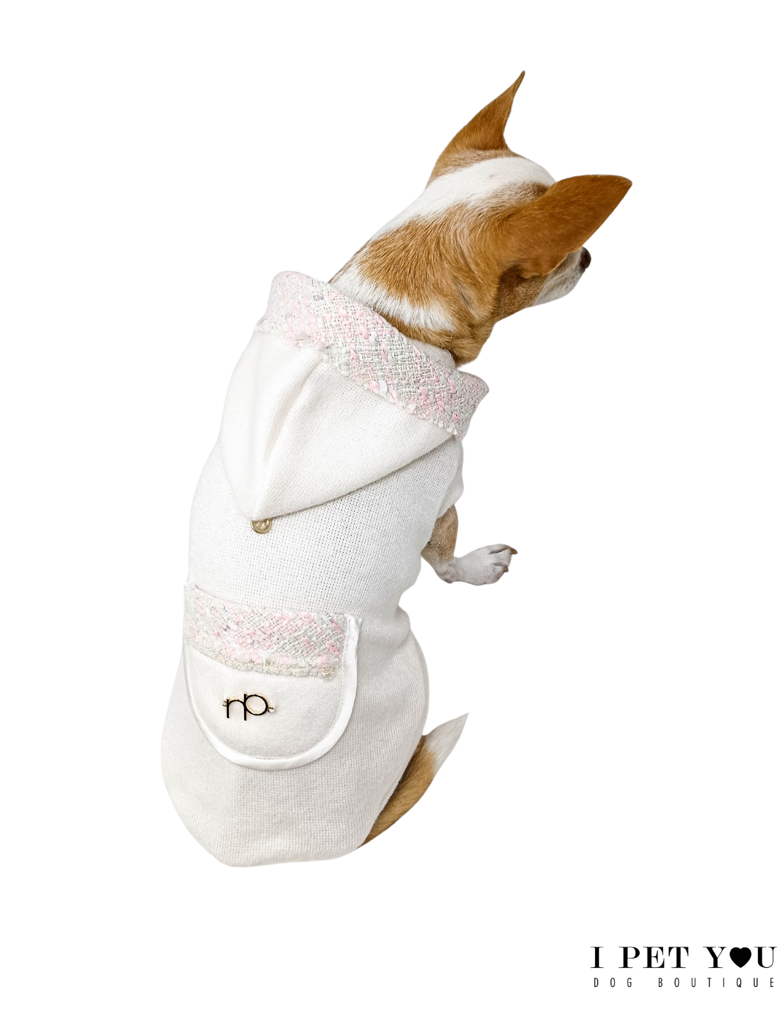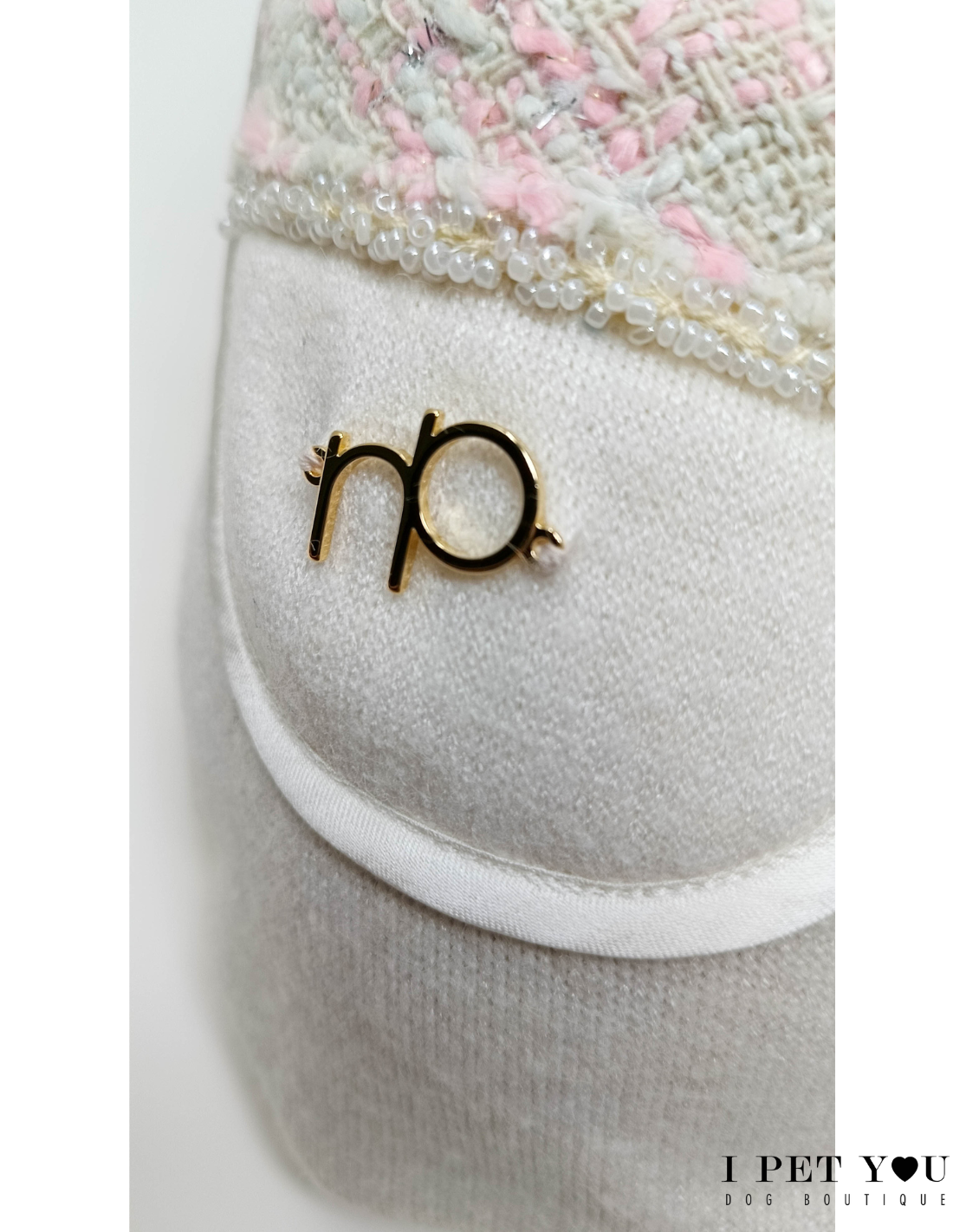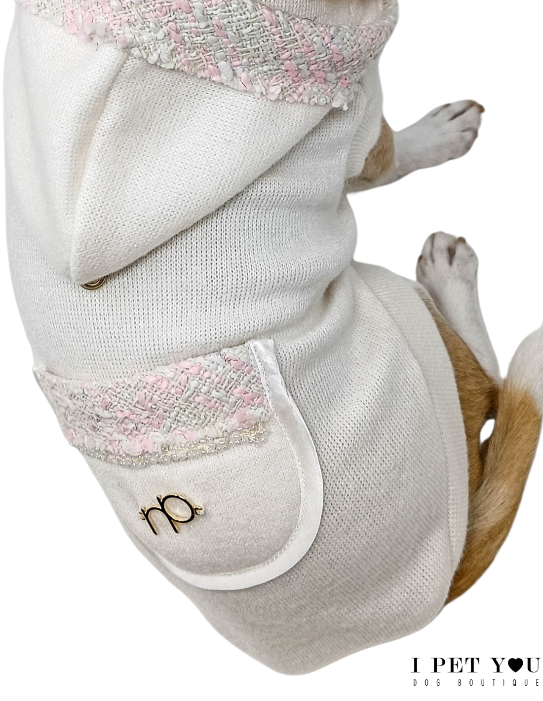 Dolcissimo pull di Not Too Pet con inserti tweed e applicazione in perline bianche.